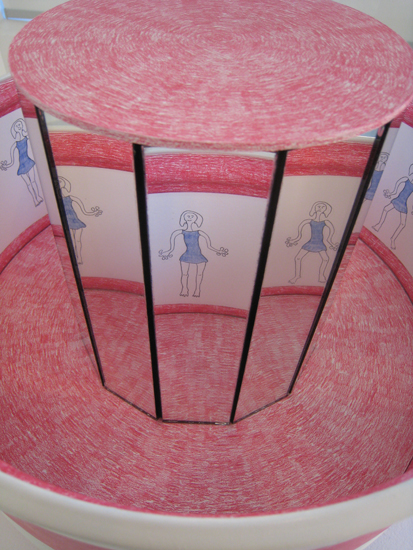 Tracey Clement, ‘Jumping Gecko Girl’ (praxinoscope), 2011, Ultrachrome inks on Hahnemuhle German Etch, 310gsm, coloured pencil on cardboard and MDF, mirror, paint, magnets, steel, bearing.