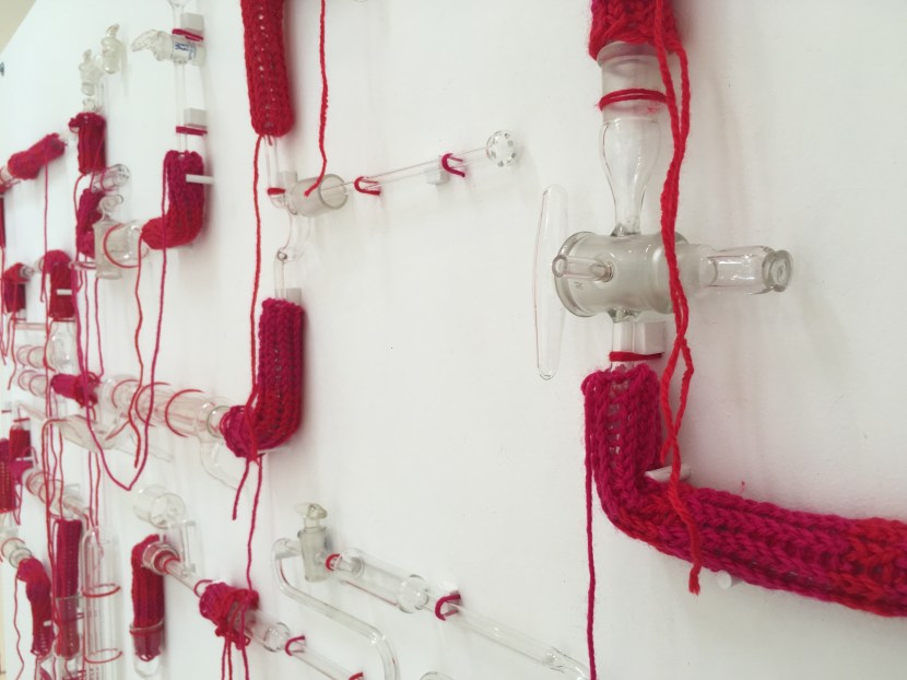 Tracey Clement, ‘Soft Science Diagram’ (detail), 2018, vintage laboratory glass, knitted and wound acrylic yarn, MDF, pine.