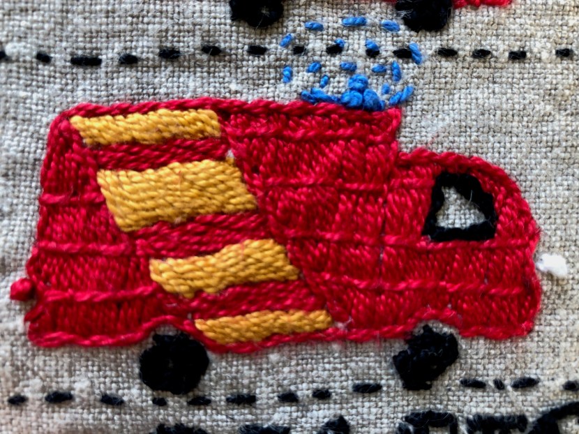 Tracey Clement, detail from ‘Tricolor,’ embroidery on linen, 1400 x 380mm, made while artist in residence at the Moya Dyring/AGNSW studio at the Cité Internationale des Arts in Paris Nov-Dec 2019.